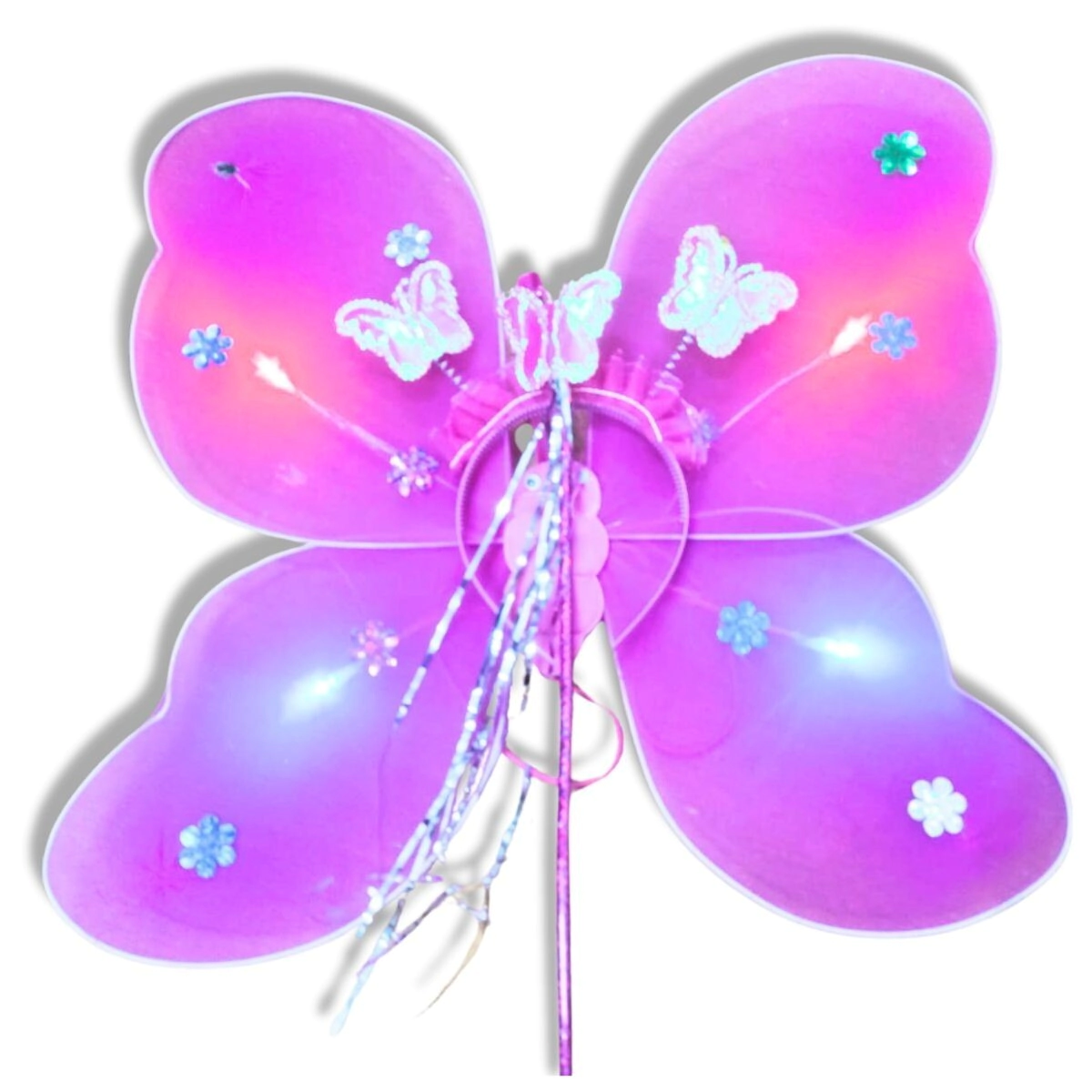 ALA MARIPOSA CON LED + VINCHA + VARITA FUCSIA