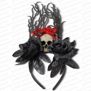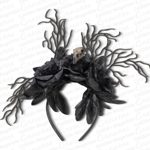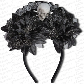 VINCHA HALLOWEEN FLORES DE TELA NEGRA Y CALAVERA