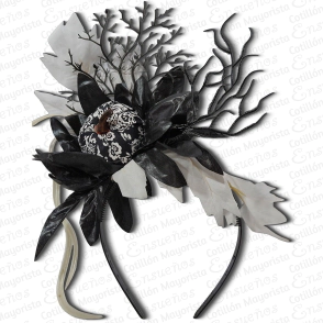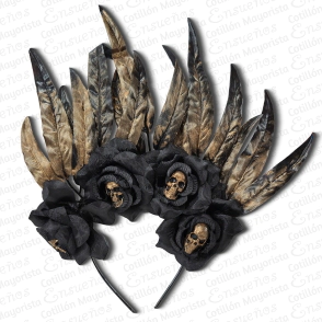 VINCHA CON ROSAS NEGRAS Y CALAVERAS DORADAS