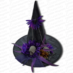 SOMBRERO DE BRUJA CON CINTAS Y CALAVERAS